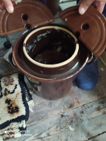 Vettem egy mázas 10 literes edényt is, amiben a saját savanyú káposztámat készítem. Gábor kezében két kerámia súly van, ebből én 4 db-ot használok (összesen így 3 kg súly). De akinek van türelme próbálkozni, használhat más nehezéket is. Én sokáig zacskóba tett kavicsokat, homokot használtam de így azért sokkal egyszerűbb:)))